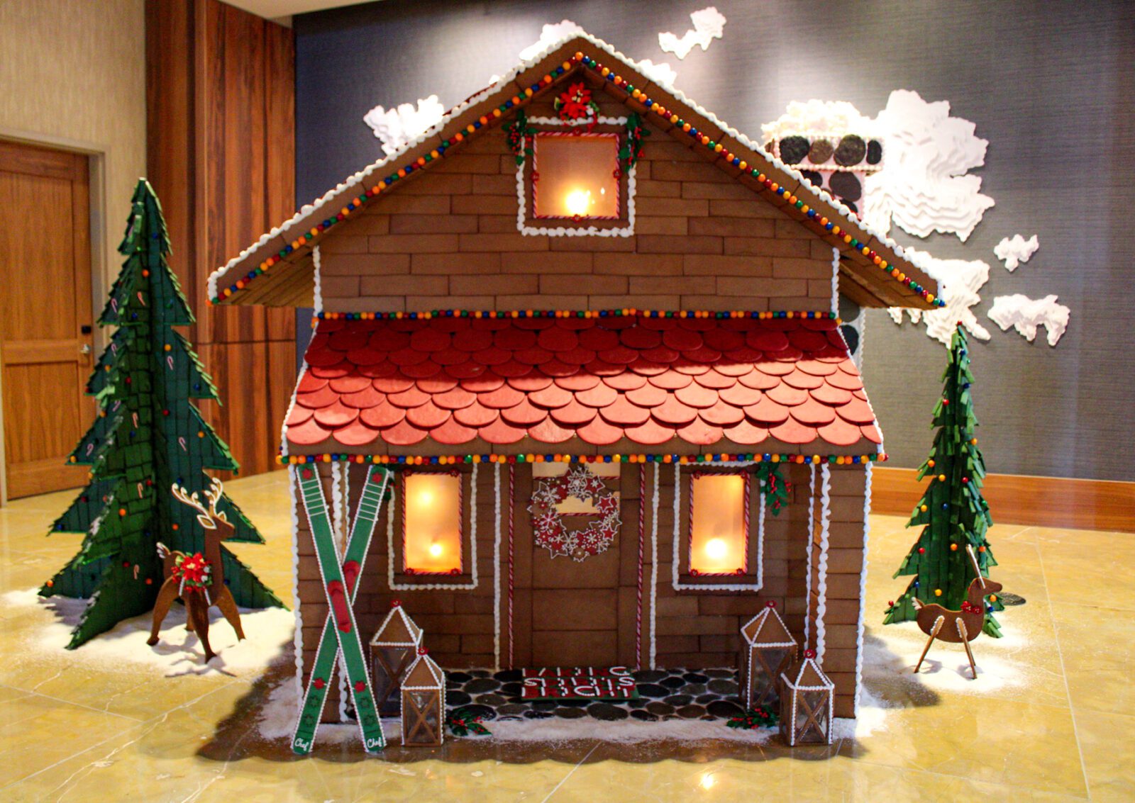 Crafted entirely from gingerbread, icing, and candy, the life-sized cabin features more than 2,000 pounds of ingredients, including: