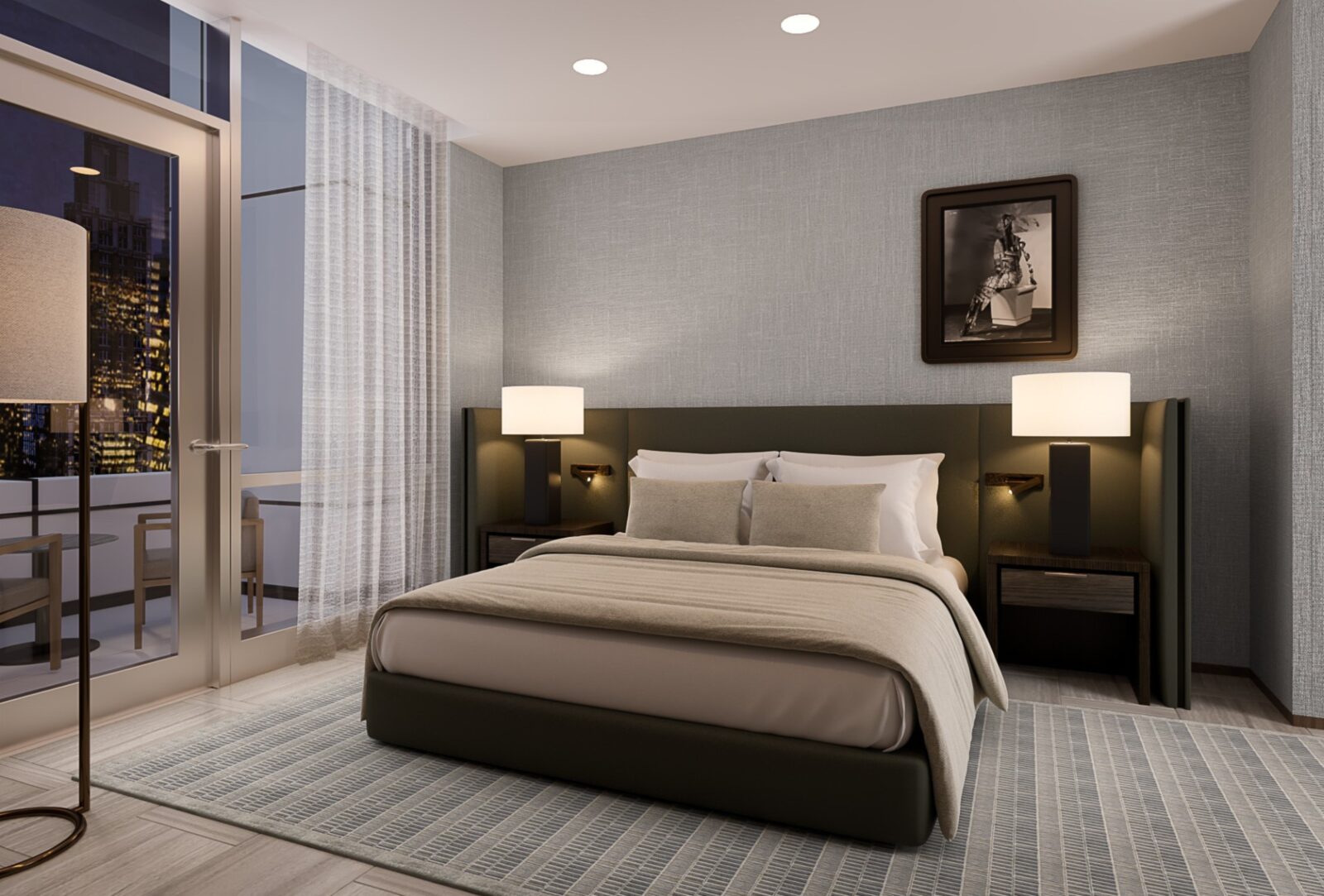 Together, these spaces will form a luxurious three-bedroom wrap-around suite, featuring 3.5 bathrooms, a spacious living area with a dining table for eight, a fully stocked wet bar, a butler’s kitchen, and a private office. Reflecting the city’s dynamic energy, the suite’s design will combine geometric and organic elements with a sophisticated palette of rich natural materials, skyscraper slate, and jewel tones. The minimalist decor will seamlessly blend luxury and tranquility, incorporating dark and light imported travertine stone, rich walnut paneling, and walls adorned with natural cloth.